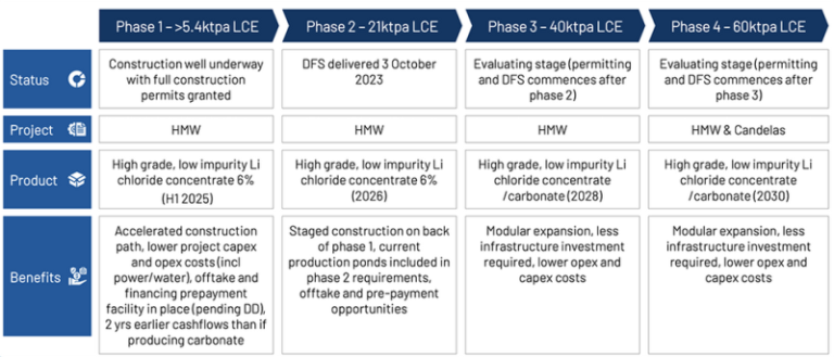 A definitive feasibility study (DFS) for phase 2 shows a 20.85 ktpa LCE operation at HMW, targeting high-quality, 6 percent concentrated lithium chloride product (equivalent to 12.9 percent lithium oxide or 31.9 percent LCE) in 2026. The DFS also indicated phase 2 will deliver a post-tax NPV (8 percent) of US$2 billion, IRR of 43 percent and free cash flow of US$236 million per year. Phase 2 provides an exceptional foundation for significant economic upside in phases 3 and 4, targeting 60 ktpa LCE production by 2030.
