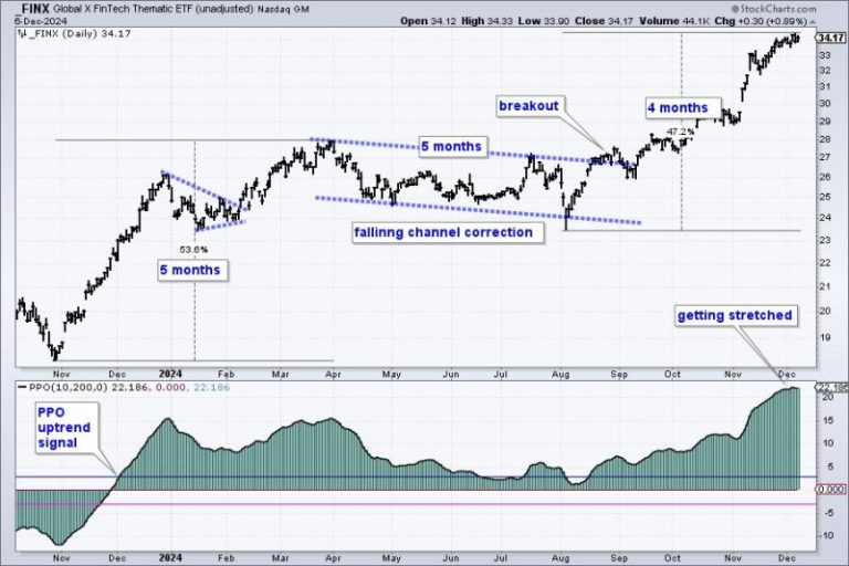 Chartists looking for stock setups can start with strong industry groups. The Fintech (FINX) is in a strong uptrend and leading, but looking extended short-term. While there is no setup currently, we can learn from past setups and apply these lessons to stocks within the group. FINX is both strong…